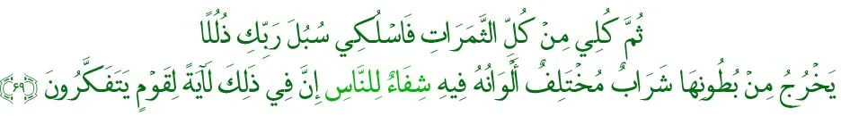 سپس از همه ميوه ها بخور و راههاى پروردگارت را فرمانبردارانه بپوى [آنگاه] از درون [شكم] آن شهدى كه به رنگهاى گوناگون است بيرون مى آيد در آن براى مردم درمانى است راستى در اين [زندگى زنبوران] براى مردمى كه تفكر مى كنند نشانه [قدرت الهى] است (۶۹)