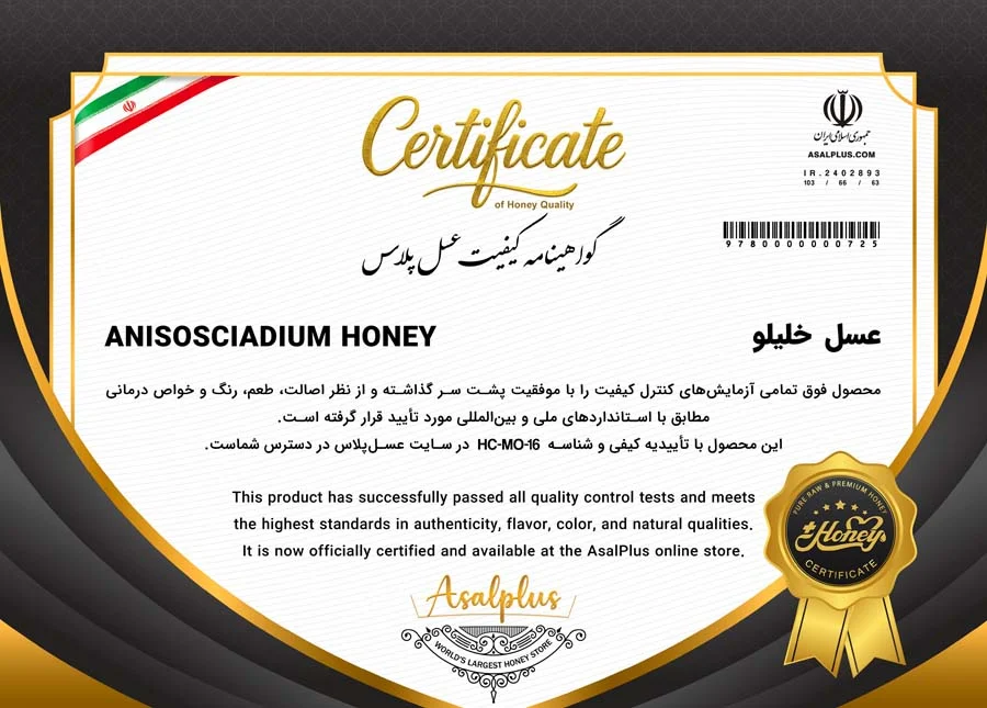 این عسل رنگی طلایی روشن تا کهربایی دارد و بافتی روان و شفاف دارد. طعم آن شیرین و مطبوع با عطری گیاهی و کمی تند است و کریستال شدن آن کند اتفاق میافتد، بنابراین بافت نرم و لطیف باقی میماند.