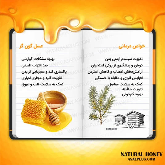 عسل طبیعی: عسلی خالص و بدون افزودنی که مستقیم از کندو برداشت شده و هیچ فرآوری شیمیایی روی آن انجام نگرفته است.
