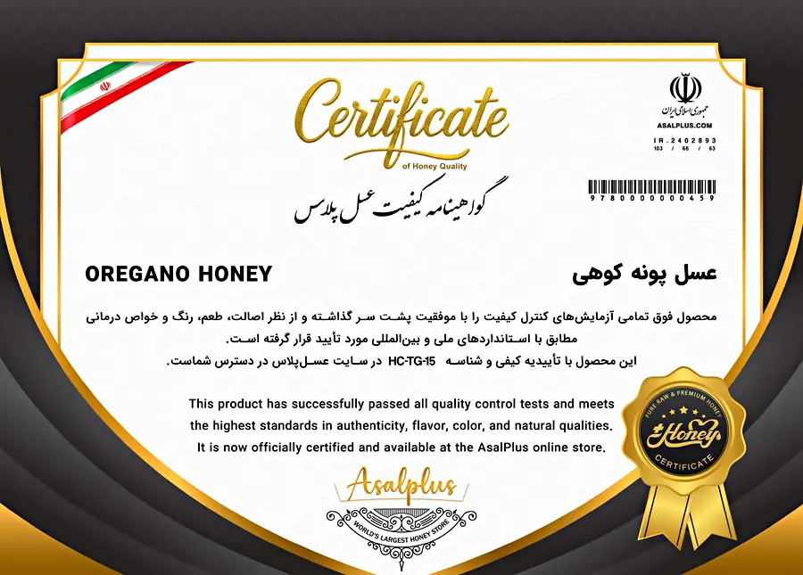 دریافت گواهینامه ISO 9001 نشان‌دهنده‌ی تعهد عسل پلاس به کیفیت پایدار و رضایت مشتری است. تمامی مراحل تولید، کنترل و بسته‌بندی عسل مطابق با استانداردهای بین‌المللی کیفیت انجام می‌شود تا هر قطره عسل، همان طعم و خلوص واقعی طبیعت را حفظ کند.