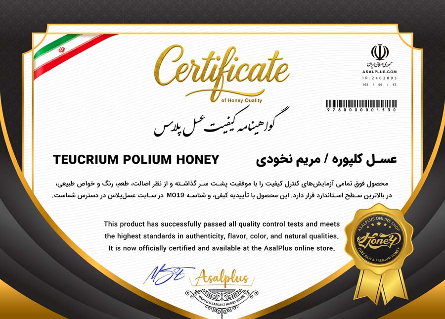 این گواهینامه اختصاصی برند عسل پلاس است و نشاندهنده تعهد ما به کیفیت، اصالت و شفافیت در عرضه محصولات میباشد. هر شیشه عسل با این نشان، تحت کنترلهای دقیق داخلی و آزمایشهای تخصصی قرار گرفته است.